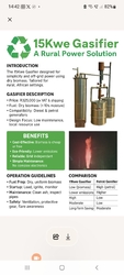 The 15Kwe Gasifier is designed for simplicity and functionality in rural and off-grid settings. It uses homogeneous biomass with less than 10% moisture content and can power a generator with relatively simple modifications. This document provides a comprehensive overview of the gasifier, its features, benefits, and operation. The content is based on the existing "RuralGasifier.docx" document, enhanced with updated images and contact information for a complete, viewable reference.